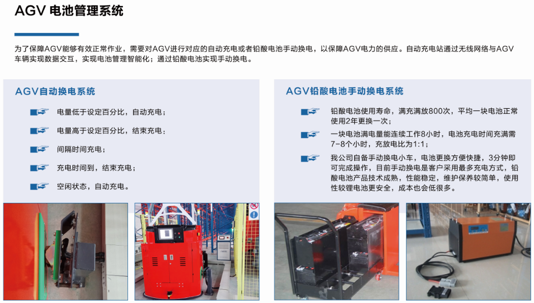 依諾瑪AGV自動換電系統:電量低于設定百分比,自動充電; 2.電量高于設定百分比,結束充電; 3.間隔時間充電; 4.充電時間到,結束充電;5.空閑時間,自動充電。